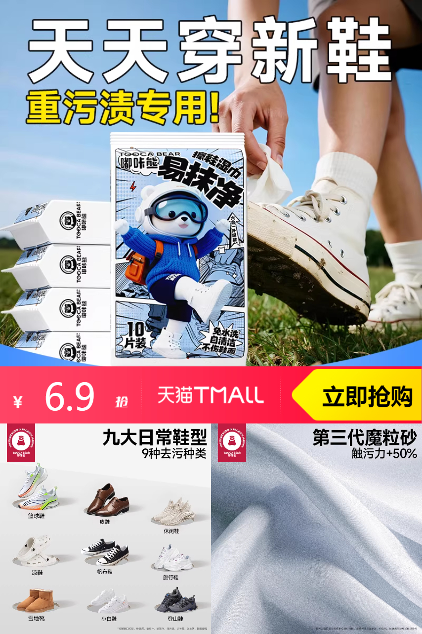 【天降到手6.9】随时随地保持光鲜亮丽,就靠这款嘟咔熊擦鞋湿巾的10抽便携装啦!小巧玲珑的设计,让你轻松携带,随时随地保持完美。