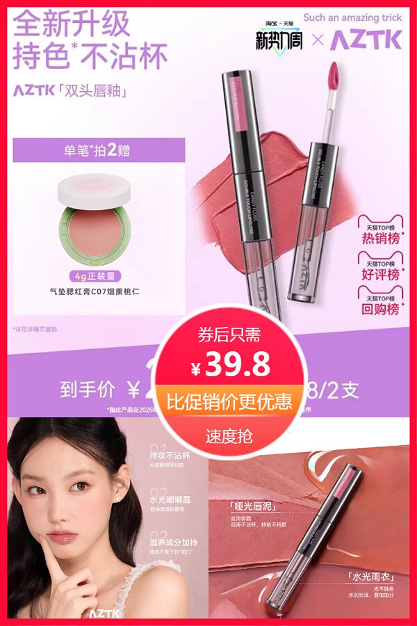 【拍两件到手三件!买两只口红就送4g正装量气垫腮红膏】双头设计黑科技!哑光+水光双效合一,一抹显色不拔干,持久锁色12小时不沾杯~全新升级配方,轻盈如唇泥,上嘴柔雾嘟嘟感,妆感高级又减龄~