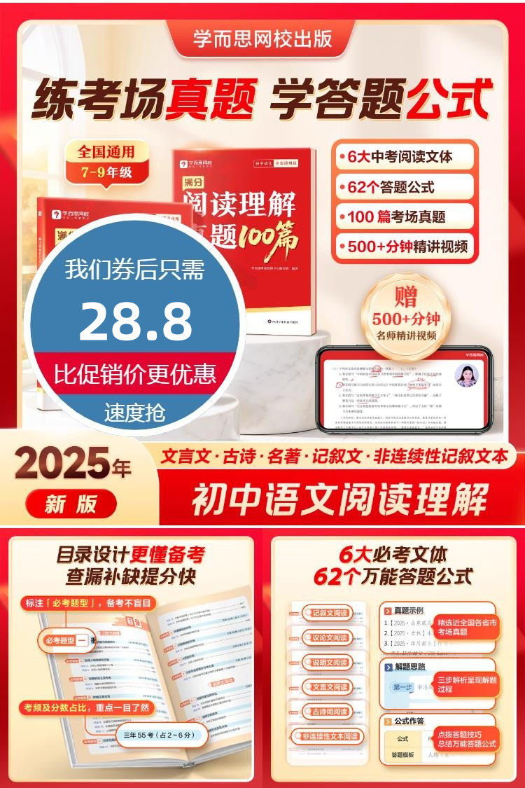 【淘金币抵扣更优惠】学而思新版初中语文阅读满分系列,6大中考阅读文体,62个答题公式,100篇考场真题,500+分钟精讲视频,学公式稳拿分,刷真题稳提分!练考场真题,学答题公式!