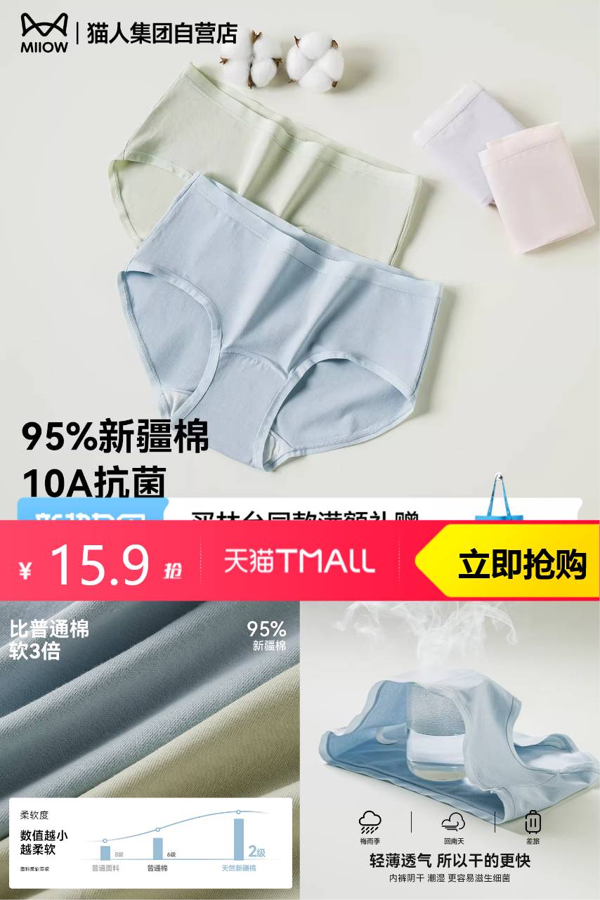 【原价49.9,领券减28,官方立减6,88vip减0.8,淘金币抵扣0.99,到手14.11,凑单消费券到手12.31】这款内裤不仅柔软透气,还具有10A抗菌功能,真正做到健康与舒适并存。