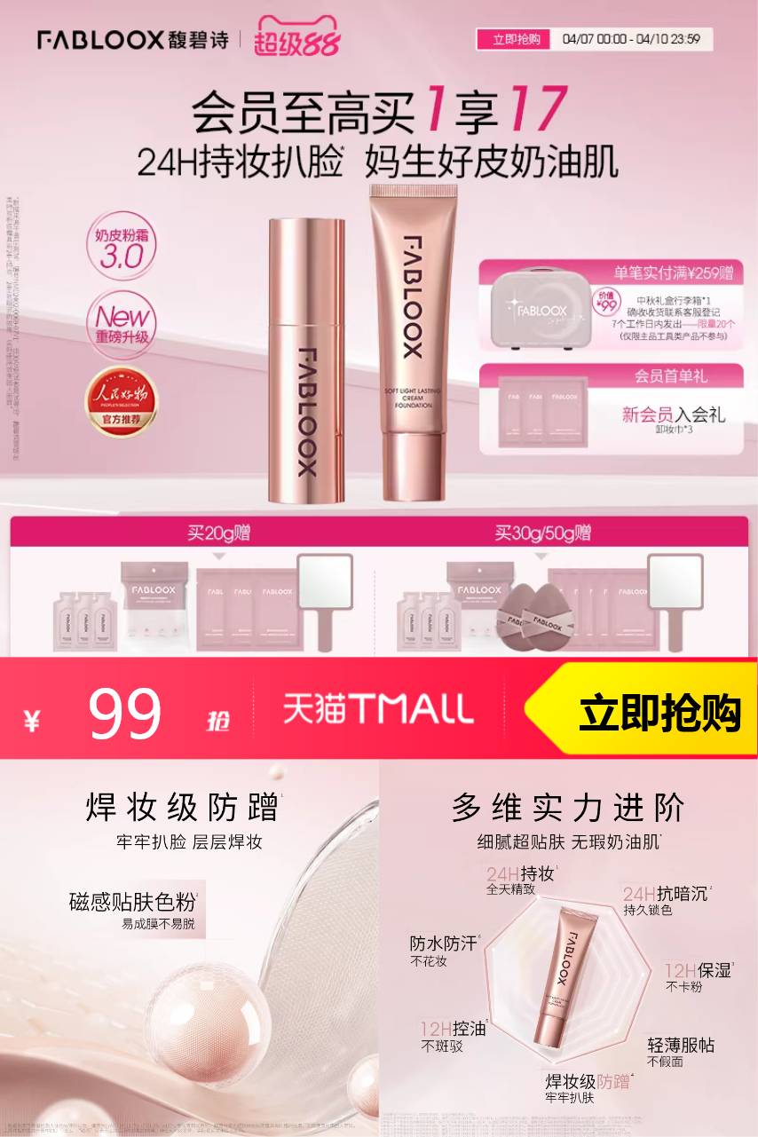 【原价149-官方立减23-店铺满减27-淘金币13.41-消费券9.72=到手75.8元左右,首次入会加赠卸妆湿巾*3】Fabloox馥碧诗粉霜油皮持妆遮瑕粉底液,长效持妆不脱妆,遮瑕力强,适合油皮使用,打造无瑕底妆!