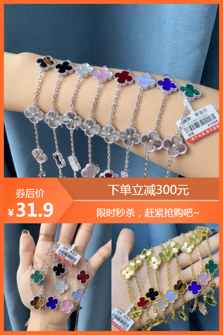 520活动促销!经典五花四叶草手链项链活动来啦!男生女生都能带买回去送爱人、送亲戚、送姐妹、送闺蜜,实物+证书+礼盒+手提袋都有!防过敏,不掉色!!网红爆款,一年四季都可戴!每款都敲美的!都超有质感,而且还不掉色!喜欢吸睛的宝子,强烈推荐!戴真的超高级的!很仙!品质保障三年内免费换新 有送三年保修卡