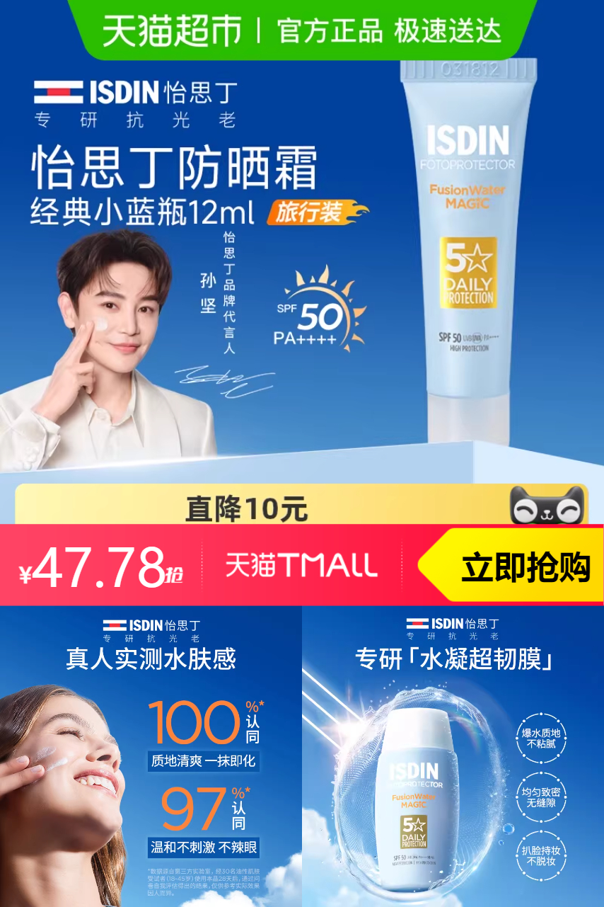 【原价159.6-立减40-超市立减71.82-88vip2.39-金币0.4=44.99到手】怡思丁防晒乳液12ml高倍隔离小样,水感清透不油腻,旅行便携必备!轻松呵护面部防晒需求!