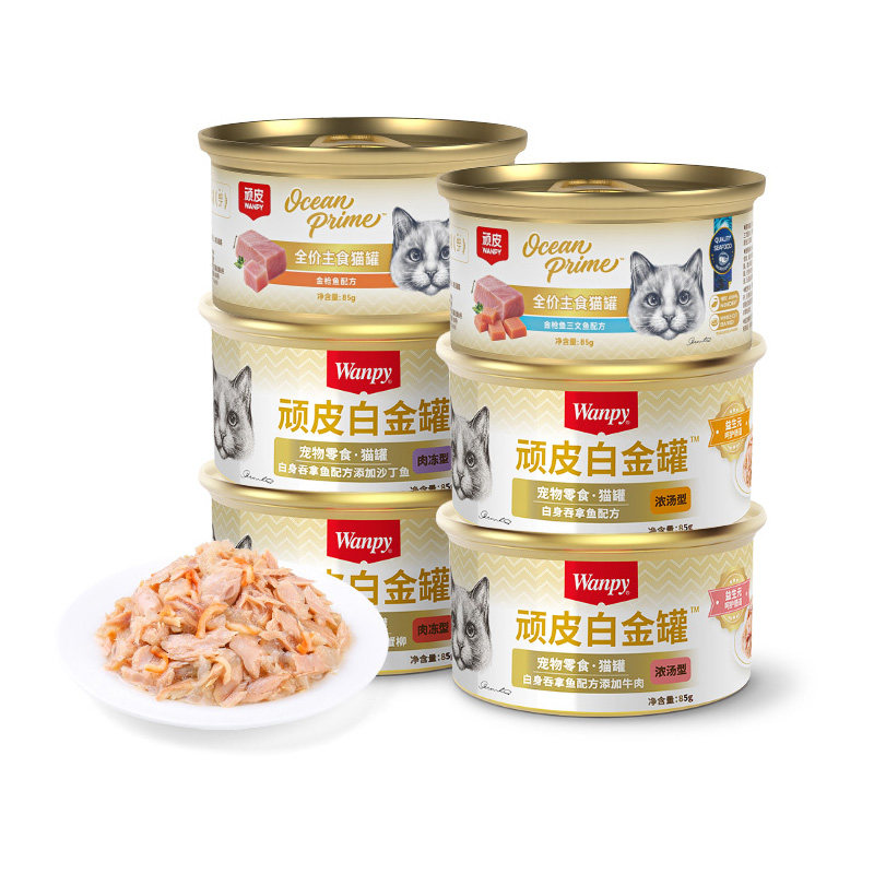 满1件,打9折,官方立减3.3,原装进口wanpy顽皮猫罐头24罐整箱猫咪零食幼成猫增肥营养补充水,打开后满满的肉香,特意兑了点水,骗他多喝水,会就吃了一罐,没有诱食剂也没有其他杂七杂八的,很干净函盈