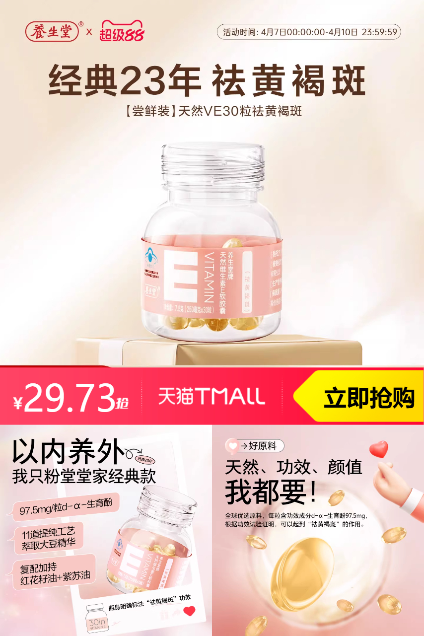 养生堂天然维生素E30粒两瓶,有效改善黄褐斑,抗氧化养肤,每日一粒,健康美丽从内而外!