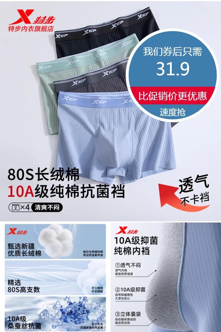 【3条/条约9元】特步男士纯棉内裤,80S新疆棉,10A级纯棉抑菌裆,舒适透气,高弹贴合,柔软亲肤!不卡档不夹PP,穿一天都没有束缚感,会让你一直回购的内裤,青少年也可以穿!