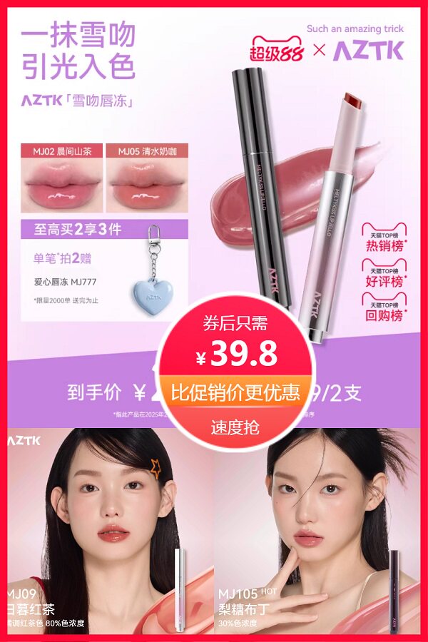 【拍两支!送爱心唇冻一个!】aztk唇冻水光镜面唇釉!固体唇蜜黑科技,一抹化水,裸色系口水感光泽,自然提气色不假白~轻盈不黏腻,长效滋润不拔干,学生党通勤族都爱的平价水光唇~