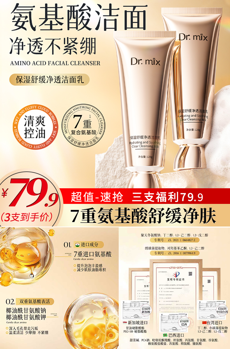 【清洁+保湿+舒缓+提亮】多·效合一的氨·基酸洗·面奶❗ 能洗得干净✔能养肤✔还能卸妆✔,一支顶三支用 里面的活性氨基酸小分子泡沫,能直接透到咱们的毛孔里,带走油脂.污垢 绵密的泡泡、不紧绷、不拔干