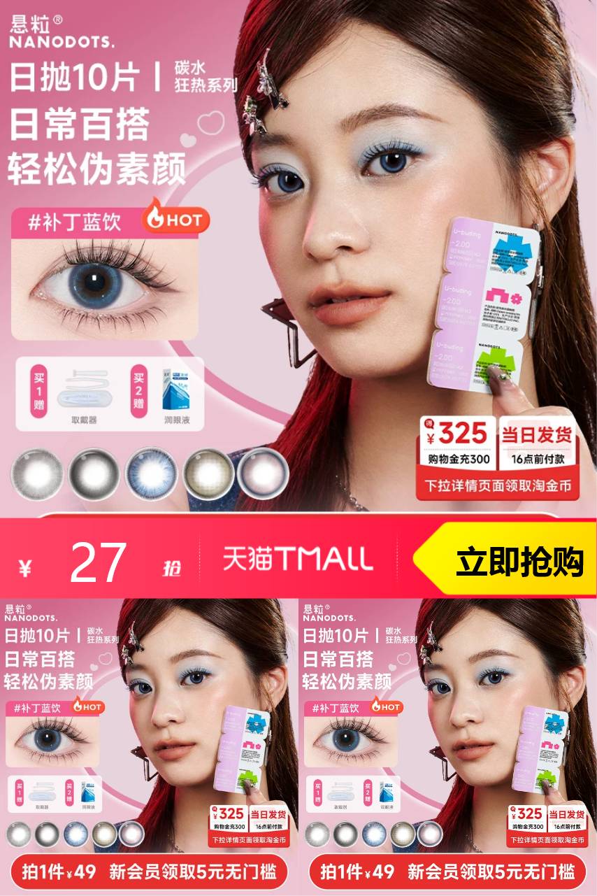 【页面价100元-官方立减12元-店铺优惠22元-单品直降39元-88vip专享天天红包2元(限4.17号)-淘金币1元=到手价24元】NANODOTS悬粒美瞳日抛10片彩色,超赞~
