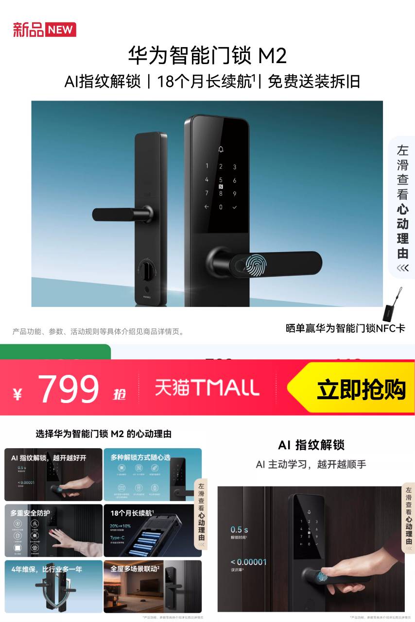 【原价799-79.9百亿补贴家装家居9折金刚券-15.98淘金币-国补15%=597.65,S单赢华为智能门锁NFC卡】华为智能门锁 M2 AI指纹解锁,AI指纹解锁,AI主动学习,越开越顺手,多重安全防护,安全的事,很全面~