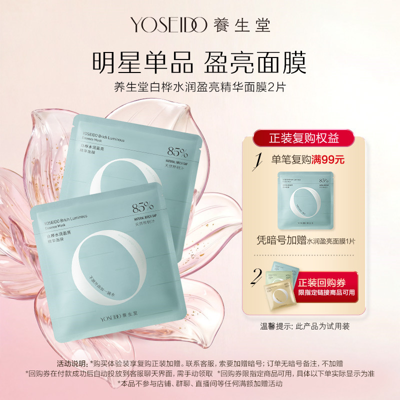 【天猫u先】养生堂桦树汁水润盈亮精华面膜温和保湿面部护肤2片