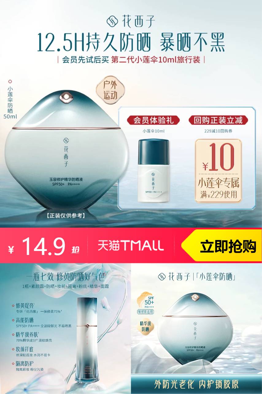 【限时立减2.7到手14.9+淘金币0.35到手14.55元】花西子小莲伞10ml旅行装,敏肌安心/高能防晒,轻薄不油腻,防晒力强,适合日常通勤和旅行使用,便携设计,随时守护肌肤!
