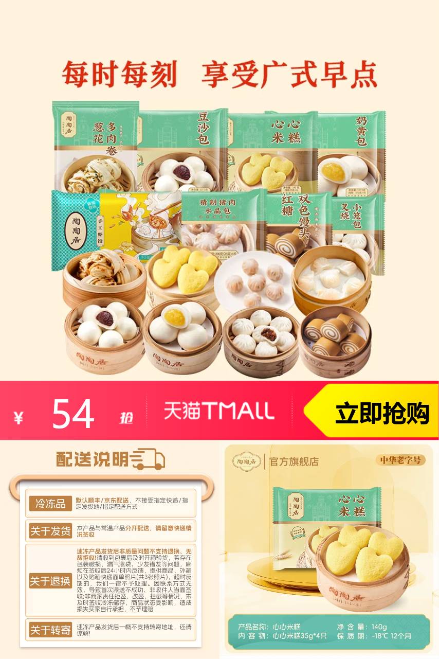 【任选5件!原价250元,满250减96元,超级立减100元,综合到手54元,折算没件10.8元】在家也能get广式早茶!味道不输线下店!陶陶居旗舰店•早餐合集上新啦!有紫米牛乳米糕、雪山香芋包、虾饺、奶黄包、芝士鸡肉卷等十几种!