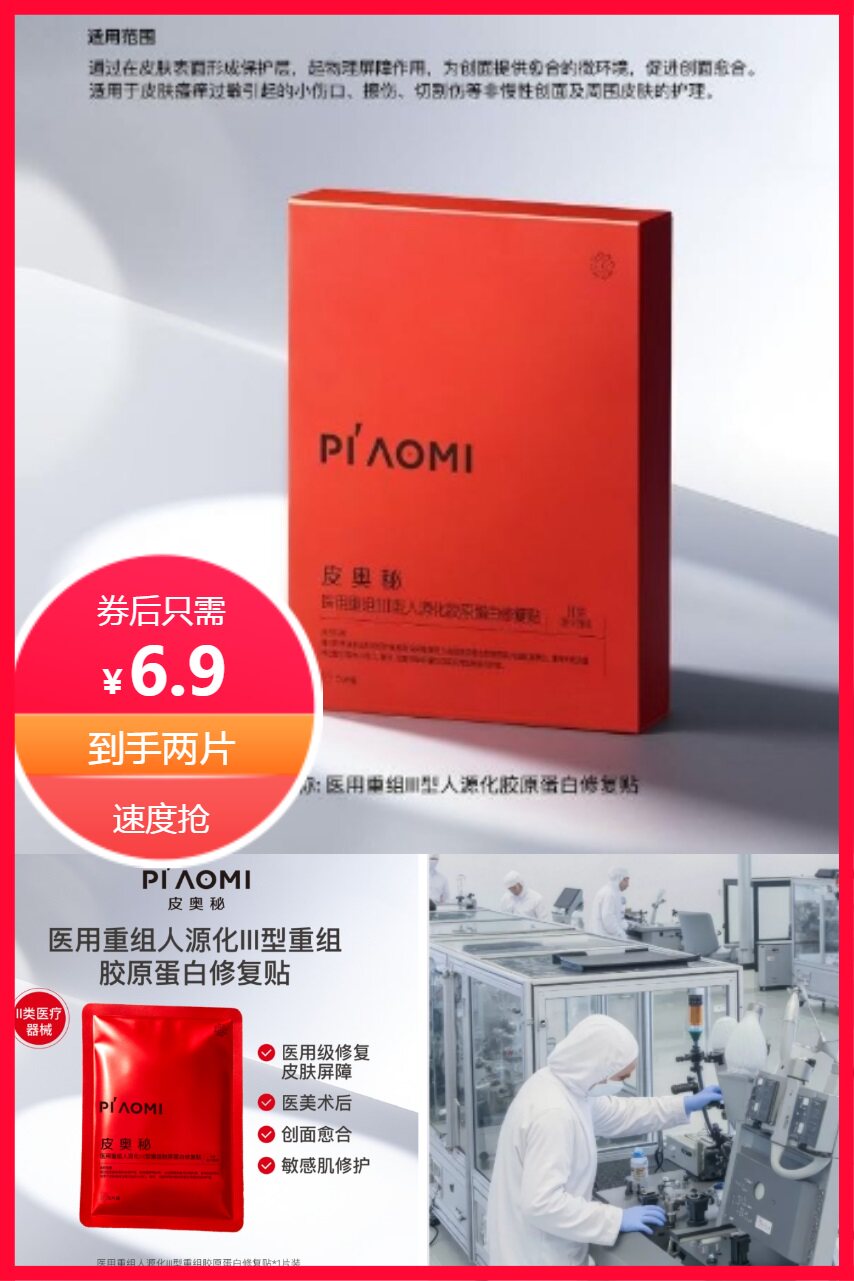 两片!皮奥秘重组人源胶原蛋白修复贴,通过在皮肤表面形成保护层,起物理屏障作用,为创面提供愈合的微环境,促进创面愈合