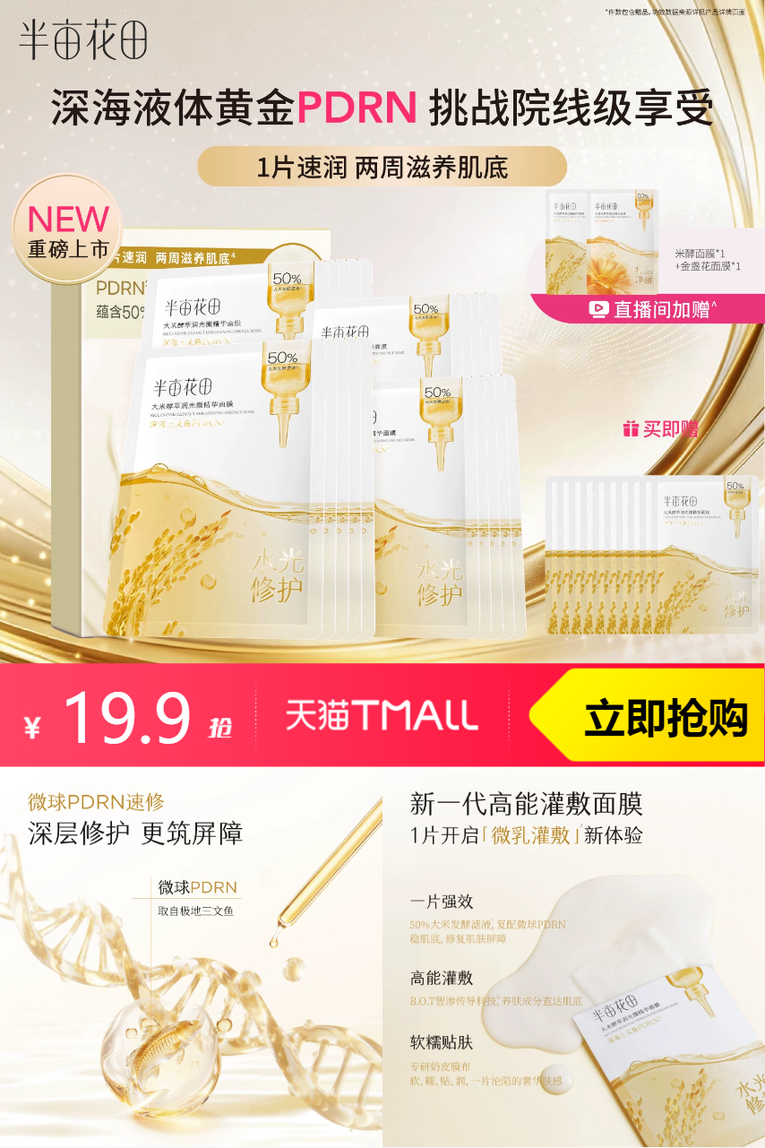 【原价59.9-立减20-券20-88vip95折1-淘金币7.18-首单礼金1=10.72元】半亩花田水光PDRN面膜,补水修护、舒缓控油,敏感肌也可用!