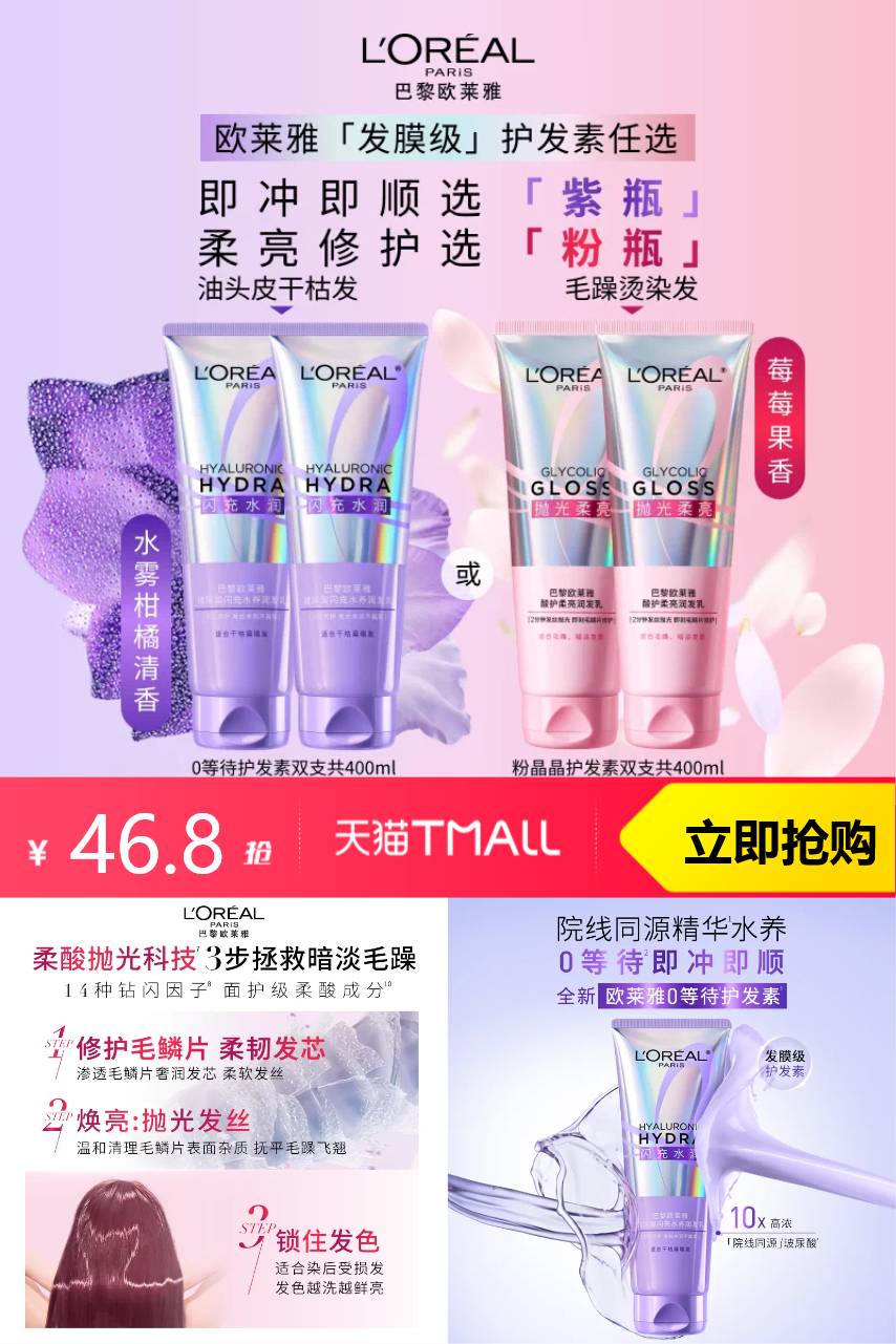 【官方立减6.4,淘金币抵扣2.65,首单立减3,凑消费券200-25,到手36.01】欧莱雅0等待护发素,护发不用等,毛躁一冲就没即刻获得柔顺垂亮水光发,院线级精华水养,轻盈修护,发丝水润不扁塌,适合干枯扁塌发,油头清爽福音护发也清爽!水水润润不油腻!