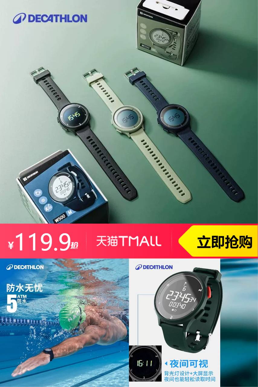 【原价119.9-淘金币2.39=117.51,叠消费券到手价更低】迪卡侬电子表防水W500,专属训练计划6大训练模式个性化训练,轻盈强韧,与你飞驰于城市~