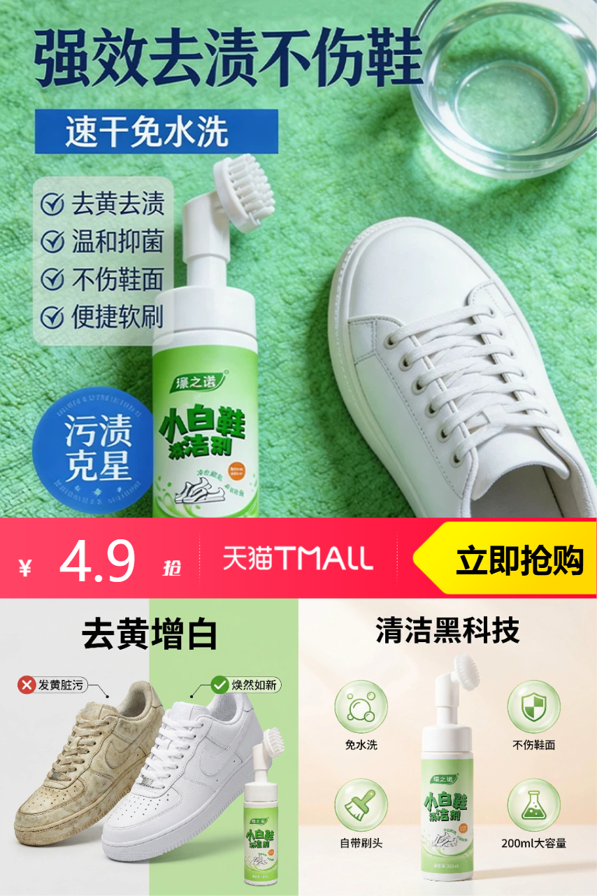 【原价29.9-立减10-优惠券15=到手价4.9】璟之诺小白鞋泡沫清洁剂,干湿两用免水洗,快速去污去黄,让小白鞋秒变亮白如新!