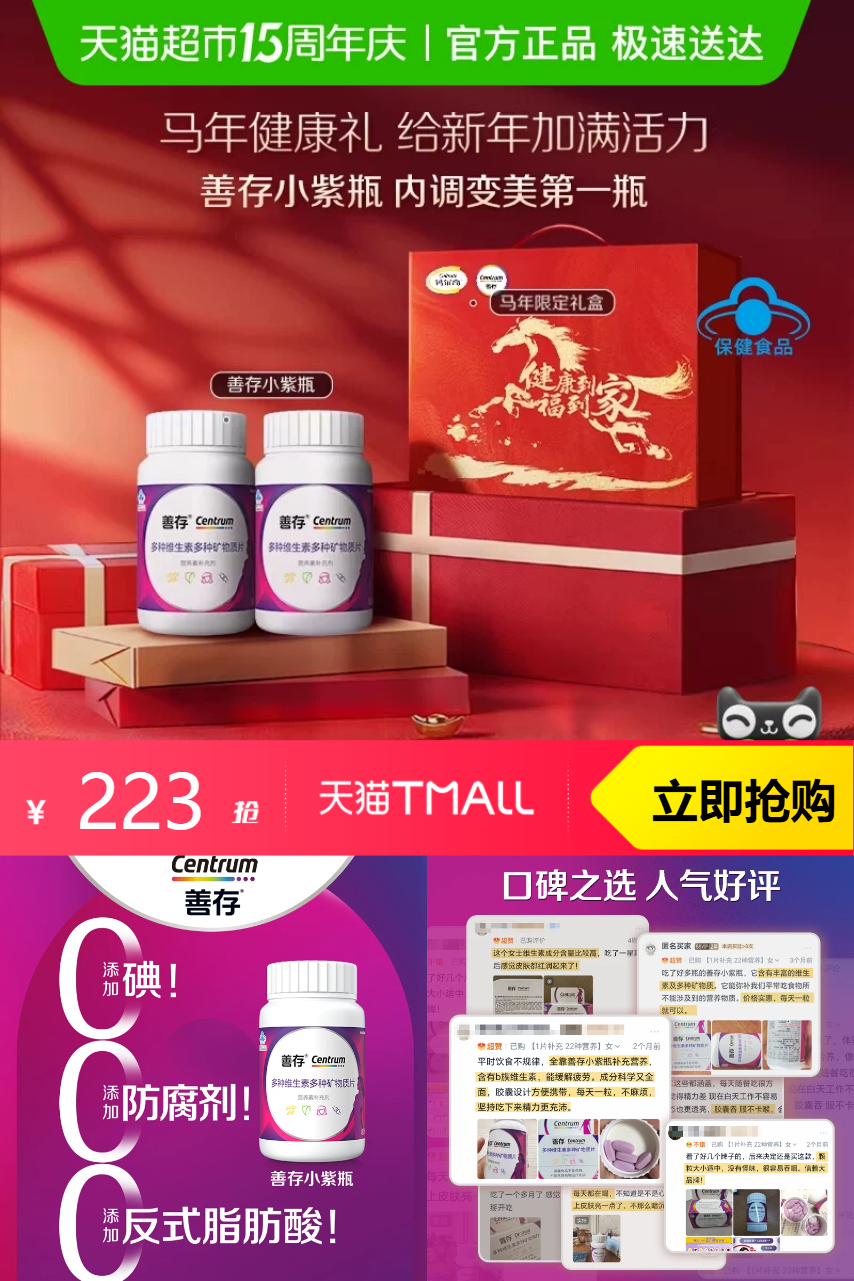 【原价298-30元券-立减55元-超市补贴68元-88vip专享9.5折抵扣7.25元-淘金币23.84元-天猫超市品牌立减20元=到手93.91元,平均1瓶到手46.95元】善存女士小紫瓶80片*2多种矿物质复维 超赞