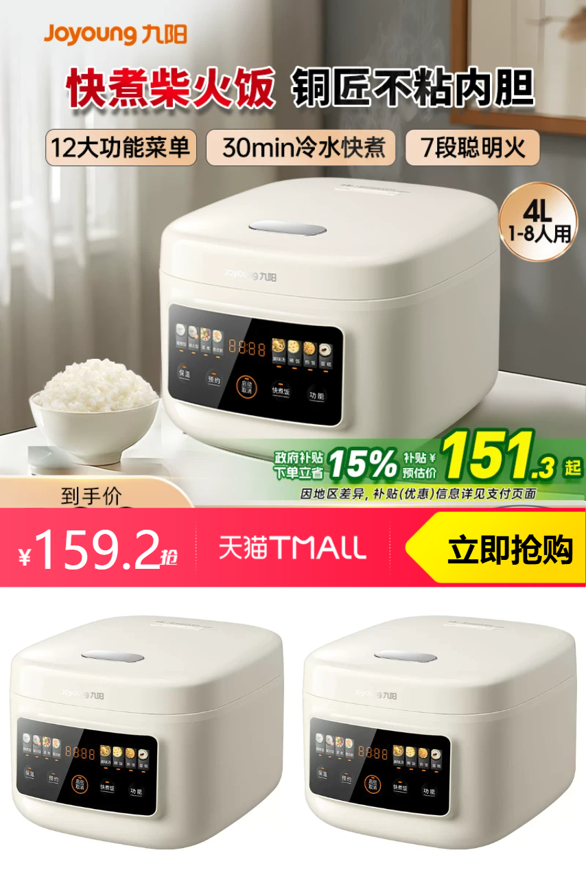 【叠加淘金币25.92元+政府补贴15%抵扣19.99元=到手仅需113.29元】政府补贴九阳4L大容量电饭锅,3-4人使用刚刚好,5重压煮技术,米饭香糯好吃!官方旗舰店正品保障,现在购买享补贴优惠,性价比超高!