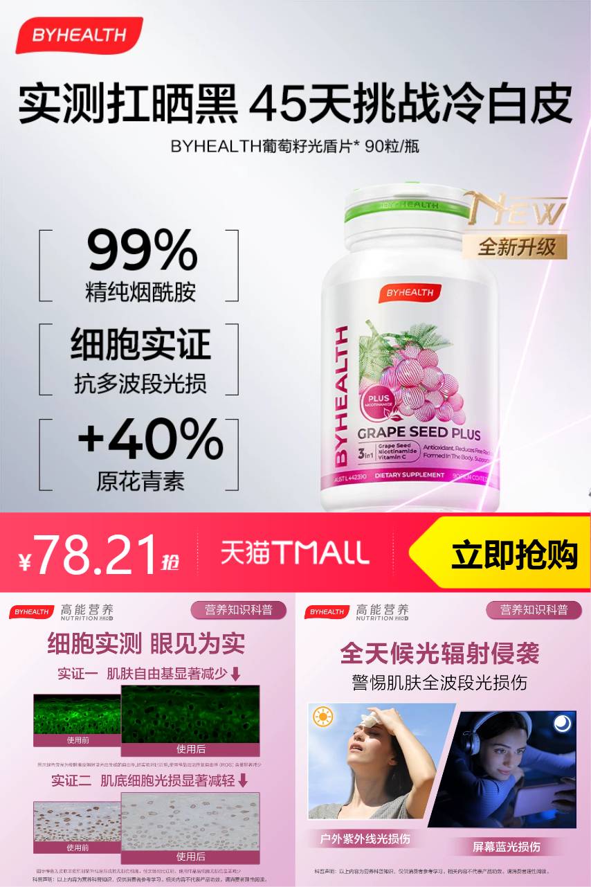 【效期至26年11月,官方立减72+满两件5.99折239.79+单品直降208+88vip95折3.91+淘金币4,到手70.3】划重点!抗光损真的不是只涂防晒就够,内服+外用双管齐下才是王炸!2瓶刚好够吃两个月,趁活动囤真的血赚,夏天想放肆玩又怕毁脸的姐妹直接冲就完事!