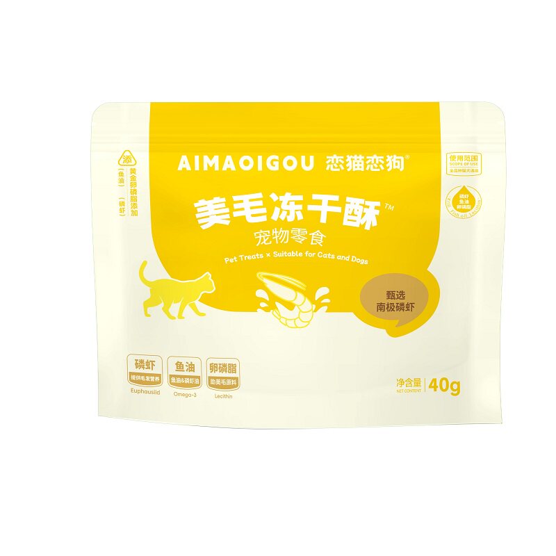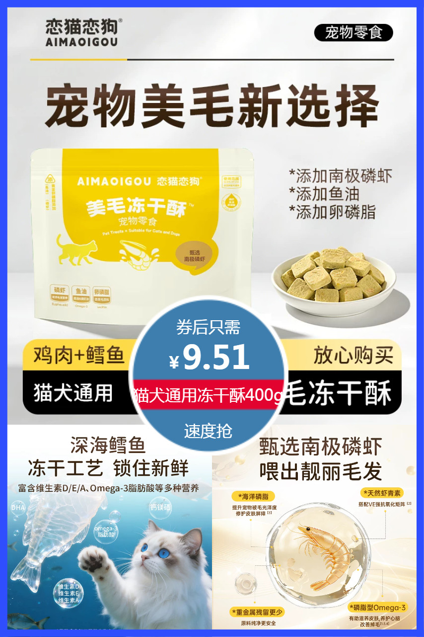 淘金币0.39元叠加劵到手9.51元!猫犬通用!恋猫恋狗宠物零食美毛冻干酥40g,宠物美毛新选择,添加南极磷虾、添加鱼油、添加卵磷脂、鸡肉+鳕鱼,多重营养成分,多效协同呵护毛发!