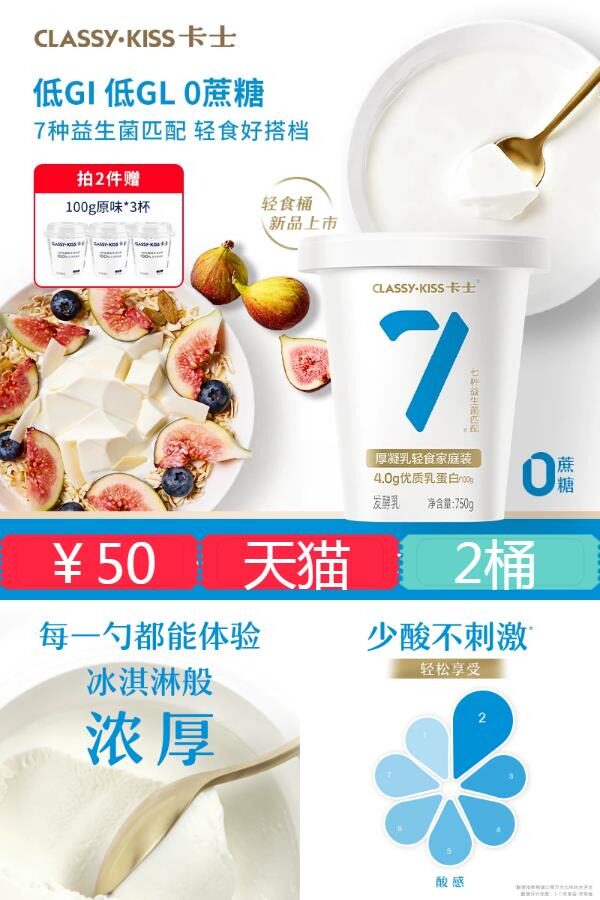 拍2件!卡士低温酸奶2桶*750g,送原味酸奶3杯*100g,厚凝乳0蔗糖,夏季冷藏轻食的不二之选~