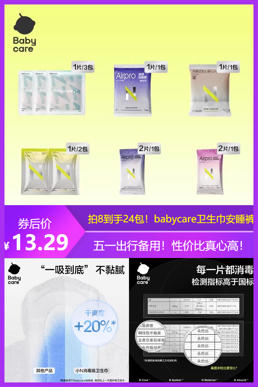 淘金币后13.29,任选8件,折1.66/件,五一出行方便携带!新品尝鲜,透气清爽,冲啊!Babycare经期无忧。医护级品质,守护你的每一刻。安睡裤,夜晚安心好眠。透气不闷热,舒适度满分。轻松出行,自信每一天。