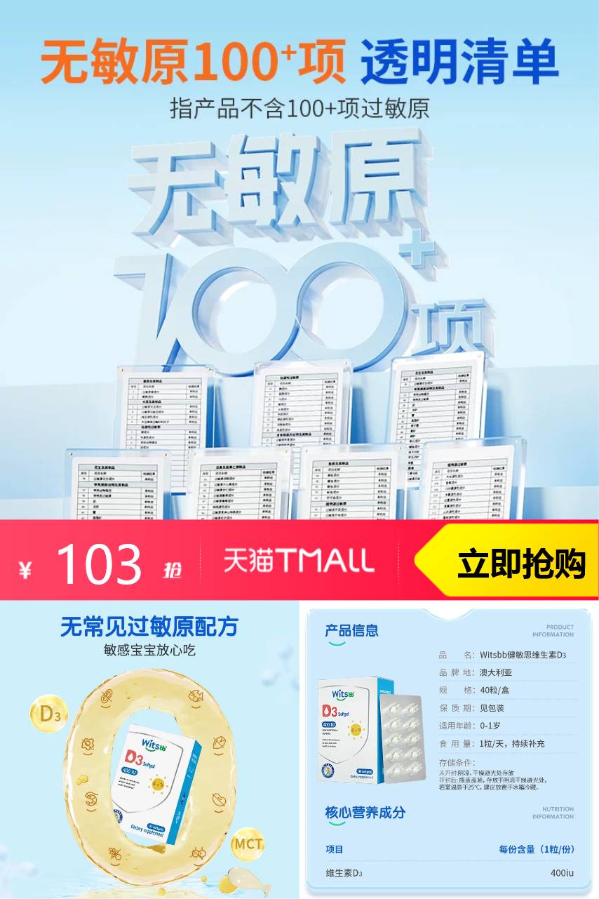 【凑消费券200-25到手仅需90.12元,合计单粒/1.12元】,witsbb健敏思婴幼儿维生素d3宝宝专用维D胶囊