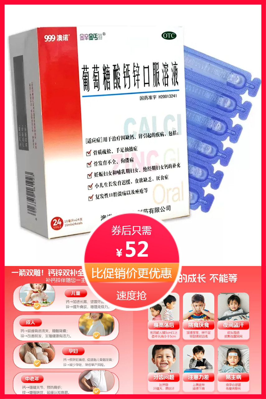 【10ml*24支*3盒到手72支】999澳诺经典配方!葡萄糖酸钙锌口服溶液,儿童成人同适用,吸收好、口感佳、无腥苦味~科学补钙锌,营养补充更安心、更划算!营养跟得上,成长更稳当!