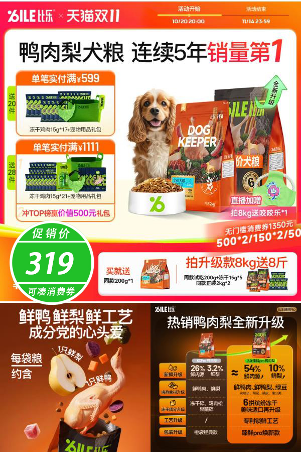 比乐鸭肉梨通用全阶狗粮12kg 11元减70 商品纠错