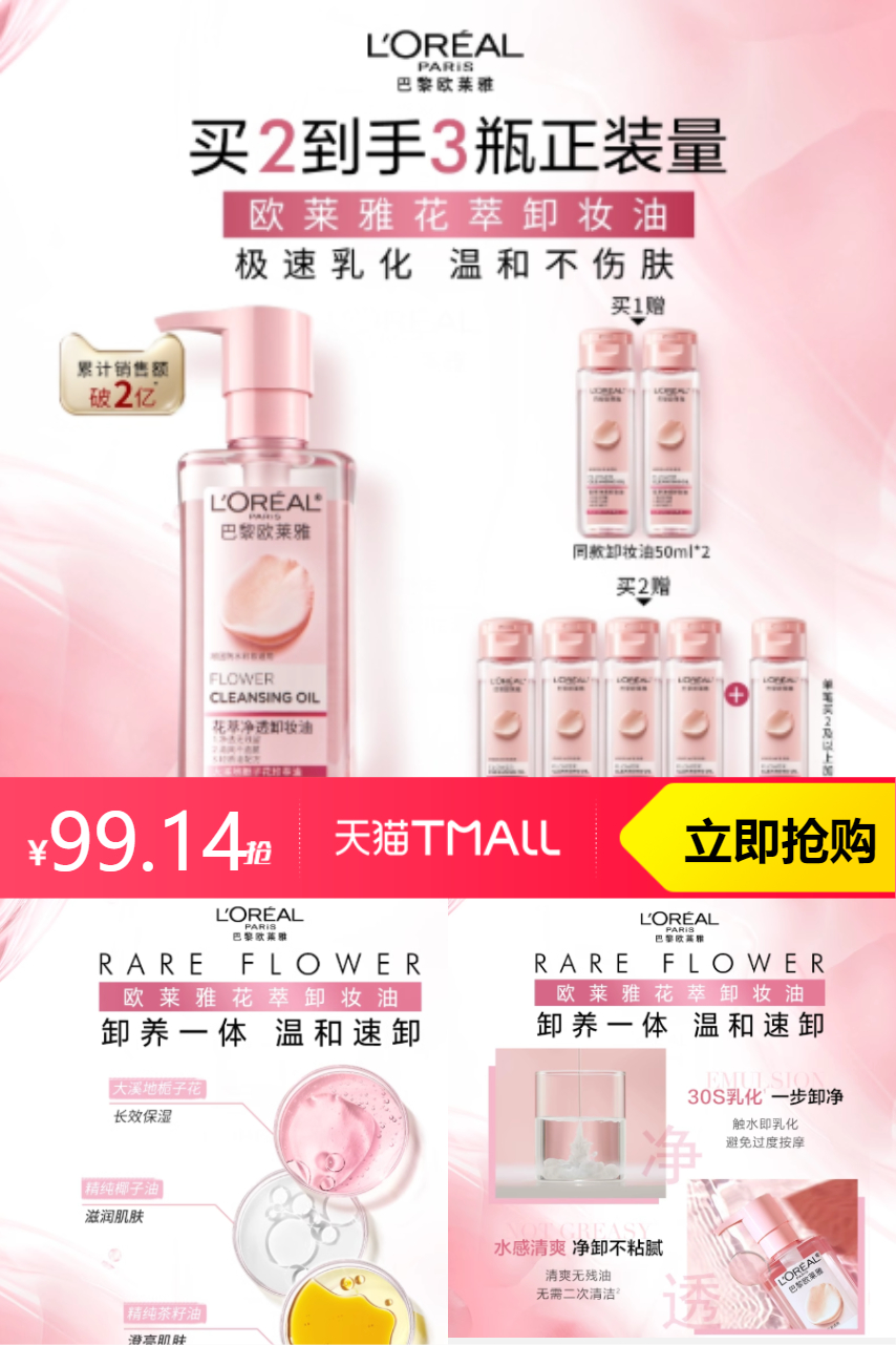 【买就送同款卸妆油50ml*2,拍2件送同款卸妆油50ml*5,叠加8.94淘金币+(500-40美妆惊喜劵抵扣11.92)到手99.14,凑单消费劵到手87.24】欧莱雅花萃净透卸妆油脸部深层250ml,清透质地 不油腻,卸养一体,温和速卸。