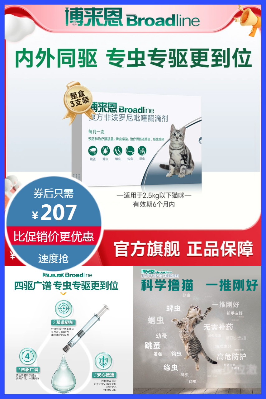 首单15元,立减55元叠加劵到手192元!博来恩猫咪专用3支,适用于2.5kg以下猫咪,创新滴管设计告别塞药烦恼,有效驱除跳蚤、跳蚤蛋、耳螨、虱子、蛔虫钩虫等,内外驱虫一支搞定,每月一次呵护全家!