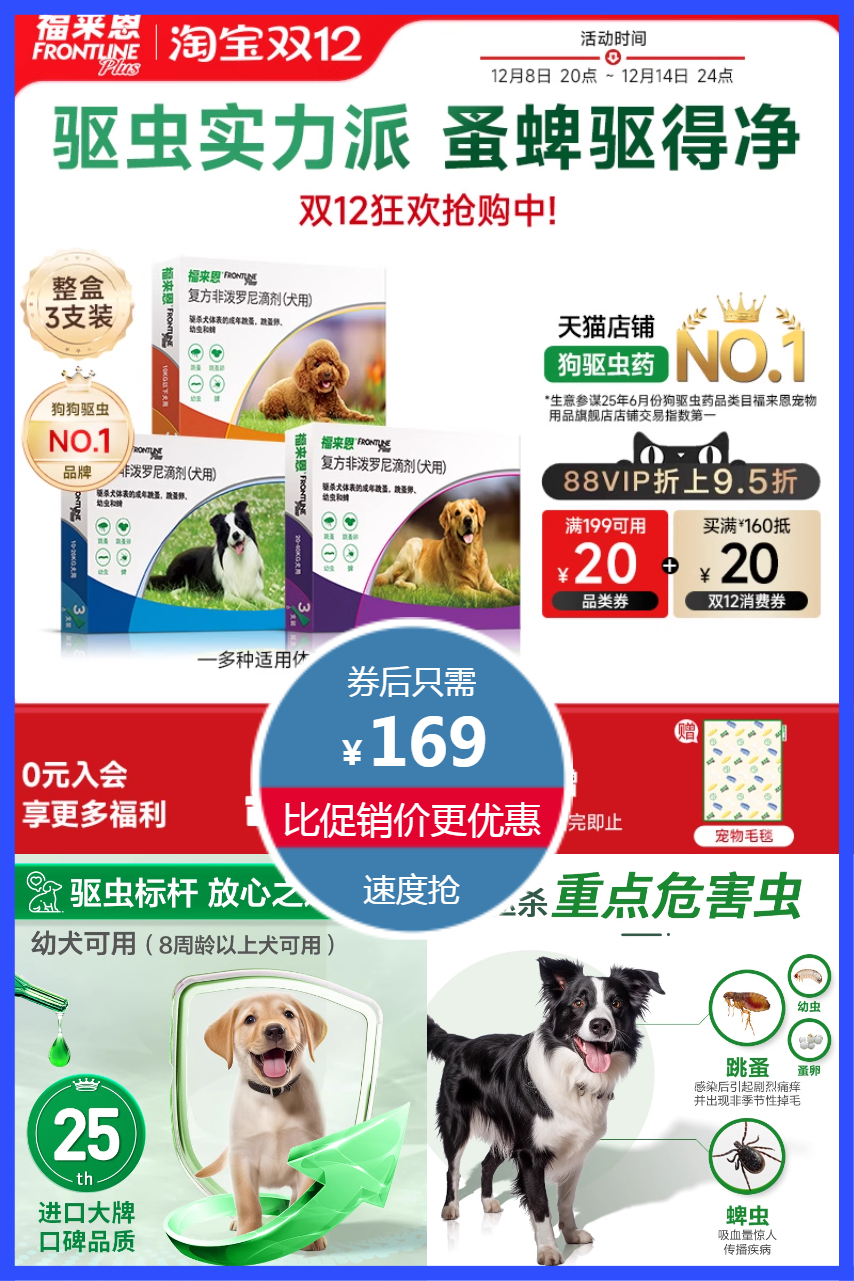 立减37元+88会员叠加券160.55元!送宠物毛毯送完为止!【法国原装进口福来恩】3支装10kg以下小狗外驱,体外驱虫小绿滴,专业20年有效驱虫,安全放心!不进入血液,狗狗驱虫药驱杀跳蚤卵幼蜱虫!复方成分非泼罗尼+甲氧普烯,驱杀全生命周期跳蚤,源头解决跳蚤反复困扰
