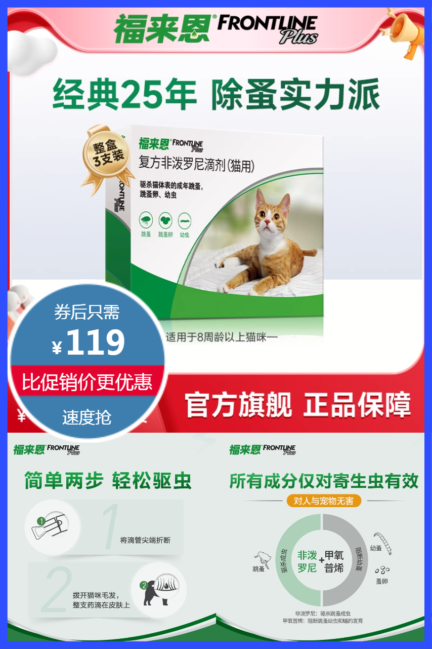 首单11元,立减50元叠加劵约108元!福来恩猫咪体外驱虫滴剂3支,适用于8周龄以上猫咪,怀孕猫,哺乳母猫安心使用,防治跳蚤、蚤卵幼虫!不进入血液药效持续一个月!