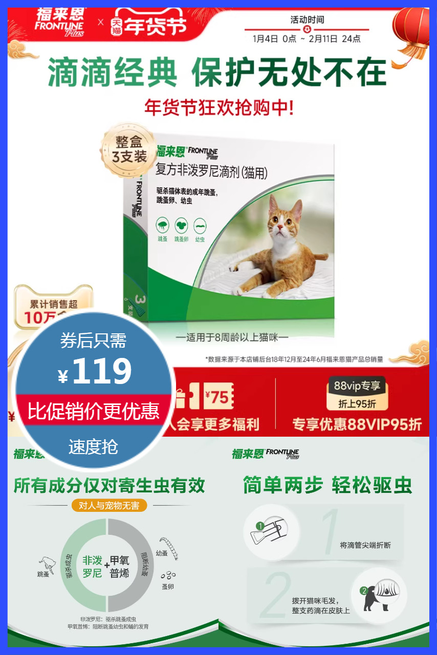 首单7元立减29元+88会员叠加劵106.05元!福来恩猫咪体外驱虫滴剂3支,适用于8周龄以上猫咪,怀孕猫,哺乳母猫安心使用,防治跳蚤、蚤卵幼虫!不进入血液药效持续一个月!