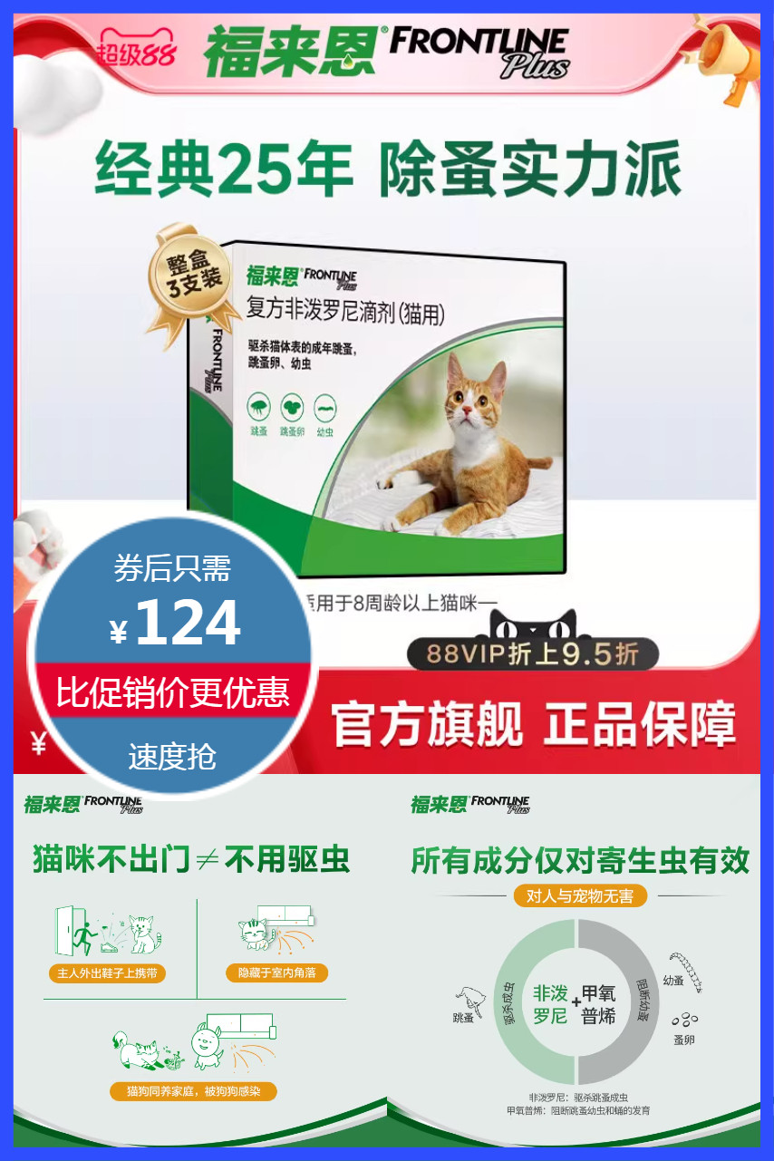 首单7元立减29元+88会员叠加劵110.8元!福来恩猫咪体外驱虫滴剂3支,适用于8周龄以上猫咪,怀孕猫,哺乳母猫安心使用,防治跳蚤、蚤卵幼虫!不进入血液药效持续一个月!