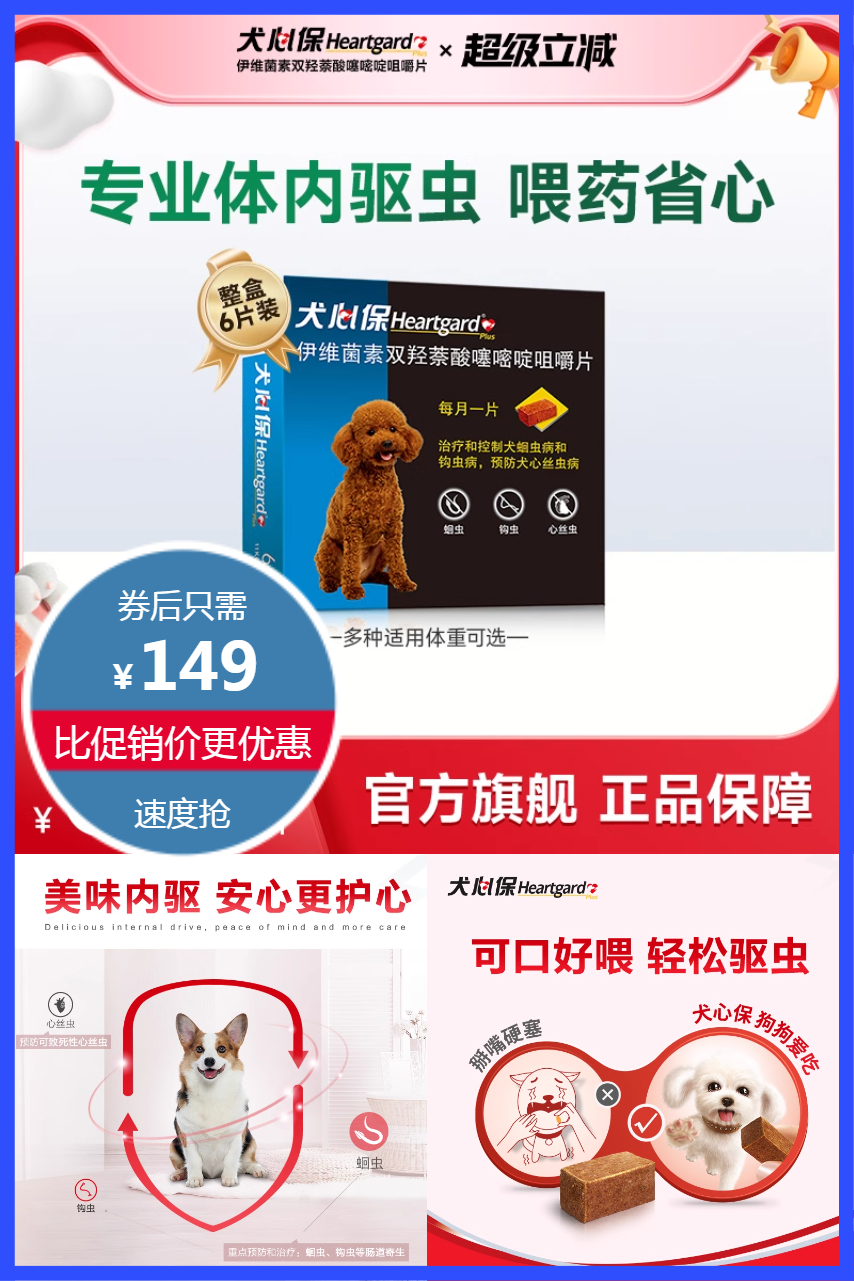 首单21元,立减60元叠加劵到手128元!犬心保6粒!11kg以下犬用,不同犬型用药不同,用于柯利犬、怀孕犬、哺乳期母犬、6周龄以上幼犬!预防心丝虫,适口性佳,适用11kg内,有效驱杀体内寄生虫!