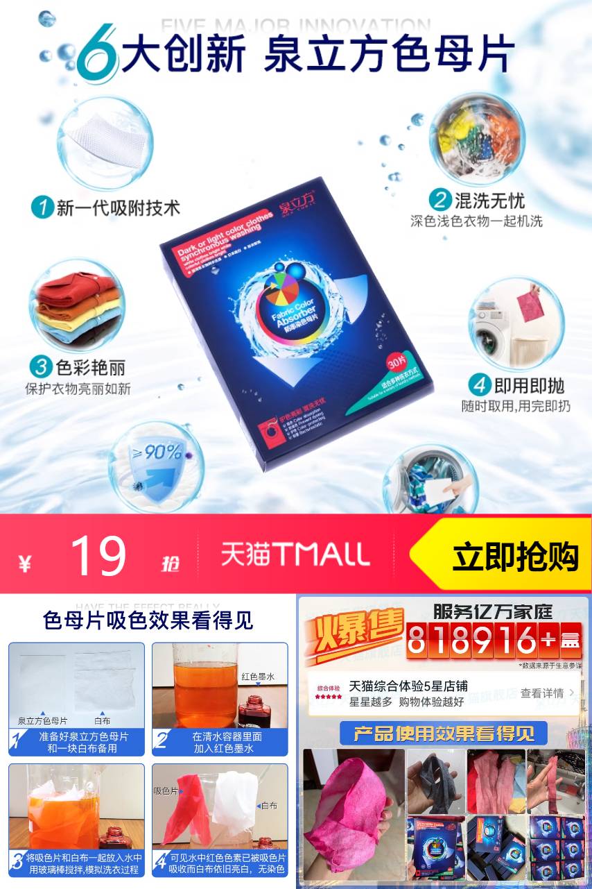 【领取2次券,拍2到手29.97元,单盒14.99更划算】深色衣服不多不少都会有点掉色!泉立方色母片推荐入手,每次洗衣放一两片,颜色被它吸收,效果不错,深浅混着洗也没事,超划算好用!