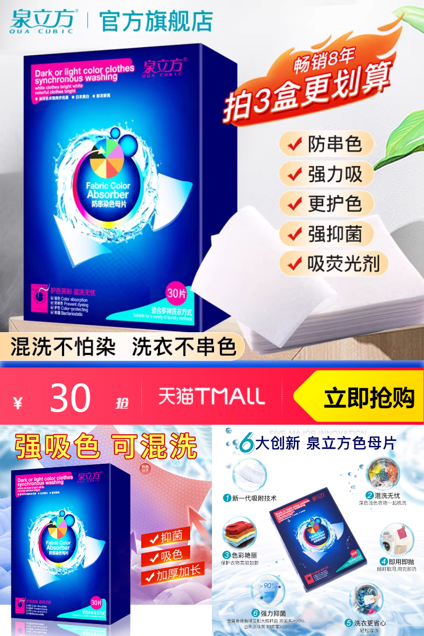 【淘金币0.98元到手29.02,拍2到手30元折14.5/盒】深色衣服不多不少都会有点掉色!泉立方色母片推荐入手,每次洗衣放一两片,颜色被它吸收,效果不错,深浅混着洗也没事,超划算好用!