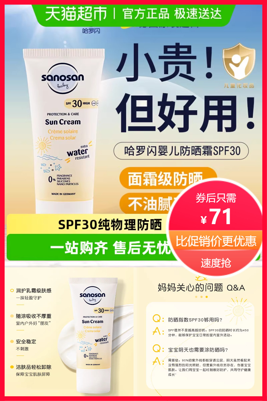 哈罗闪婴儿防晒霜防水型,防晒润肤两不误,快速成膜防水防汗,清爽吸收肤色自然,油橄榄叶精华,润肤保湿,柔然肌肤,多种小分子、维生素协助护肤,安全不刺激,用天然的爱守护宝宝肌肤!
