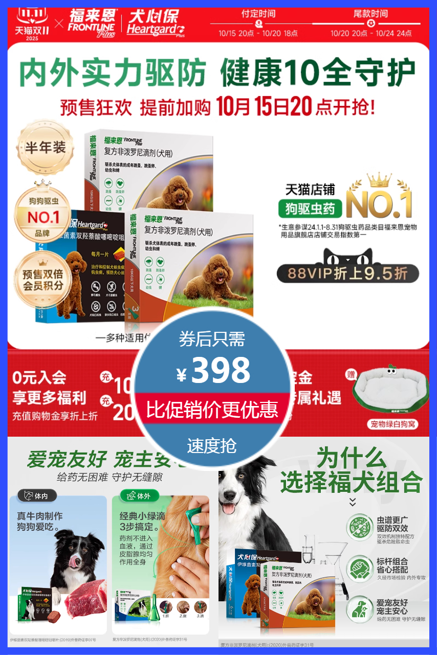 送宠物绿白狗窝!定金50元起立减78元,88会员减20.4元9折劵叠加劵尾款约289元!福来恩体内外驱虫药滴剂6支+6粒犬心保,专业20年有效驱虫,安全放心!不进入血液,狗狗驱虫药驱杀跳蚤卵幼蜱虫!