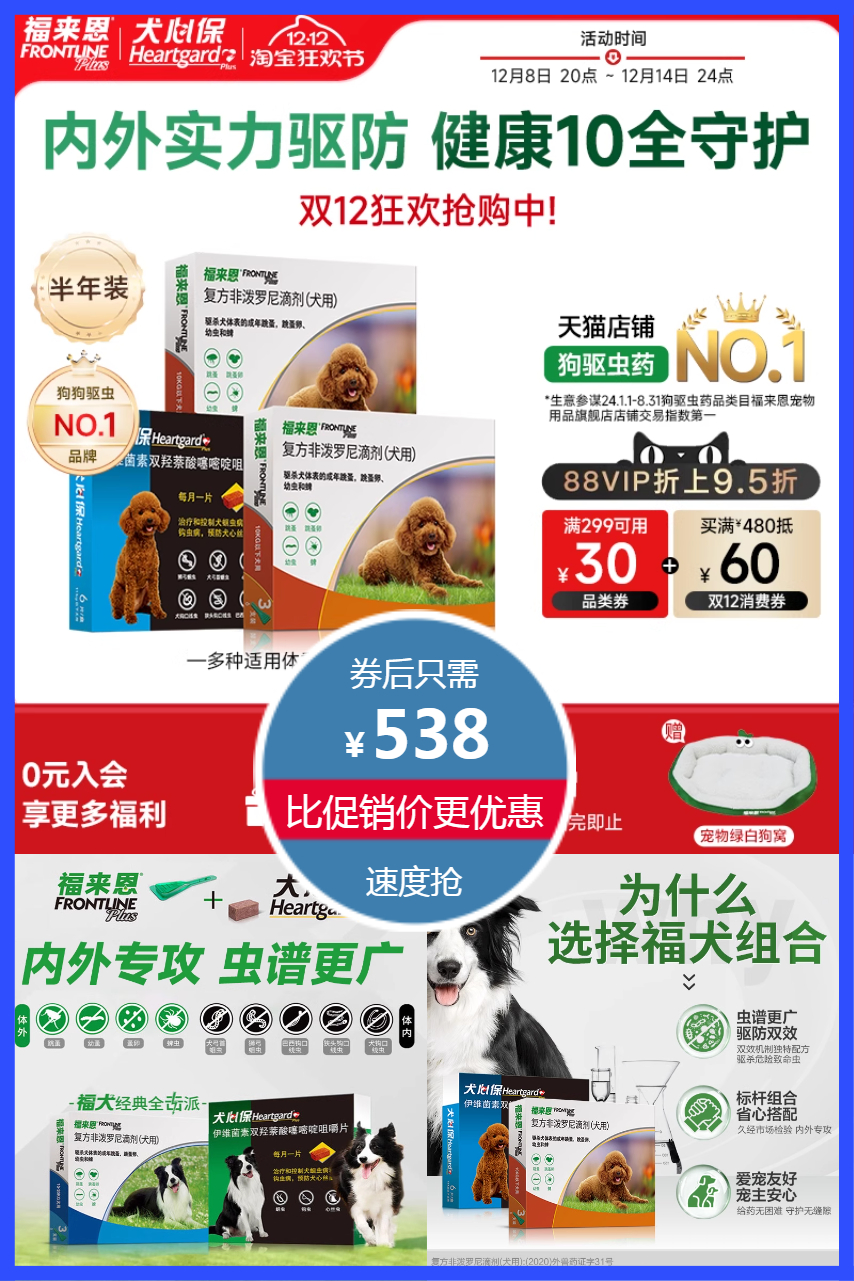 送宠物绿白狗窝!立减87元+88会员叠加劵511.1元!福来恩体内外驱虫药滴剂6支+6粒犬心保,专业20年有效驱虫,安全放心!不进入血液,狗狗驱虫药驱杀跳蚤卵幼蜱虫!