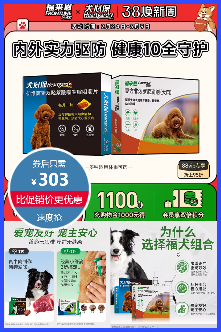首单15元+立减53元+88会员消费劵25元到手247.85元!10kg以下福来恩体外+犬心保体内驱虫药,针对性驱防4种体外寄生虫+6种体内寄生虫,防止跳蚤反复,防致死性心丝虫,驱杀5种高发肠道寄生虫,成分安心,宠主放心