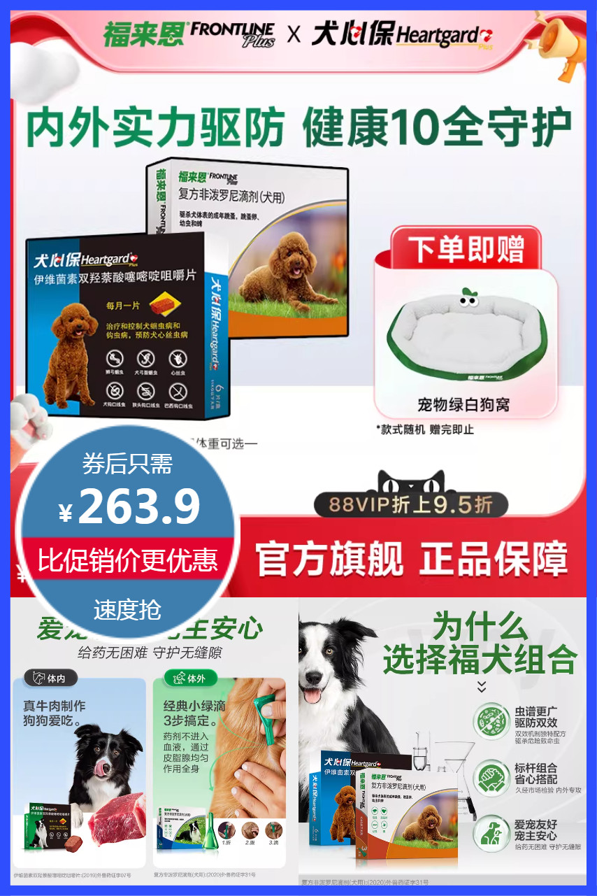 立减53元+88会员15.4元+淘金币+消费劵25元+加补20元叠加劵到手203.5元!送宠物绿白狗窝!10kg以下福来恩体外+犬心保体内驱虫药,针对性驱防4种体外寄生虫+6种体内寄生虫,防止跳蚤反复,防致死性心丝虫,驱杀5种高发肠道寄生虫,成分安心,宠主放心