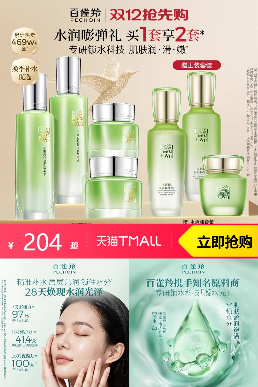 【优惠券10,立减62,会员5,淘金币12.56,到手191.44,买就送水清漾水100ml+水清漾精华乳100ml*1+水清漾霜50g】【立即抢购】 百雀羚水嫩倍现水乳套装补水,大小分子玻尿酸x7重氨基酸解锁澎润力 肌肤喝饱水~