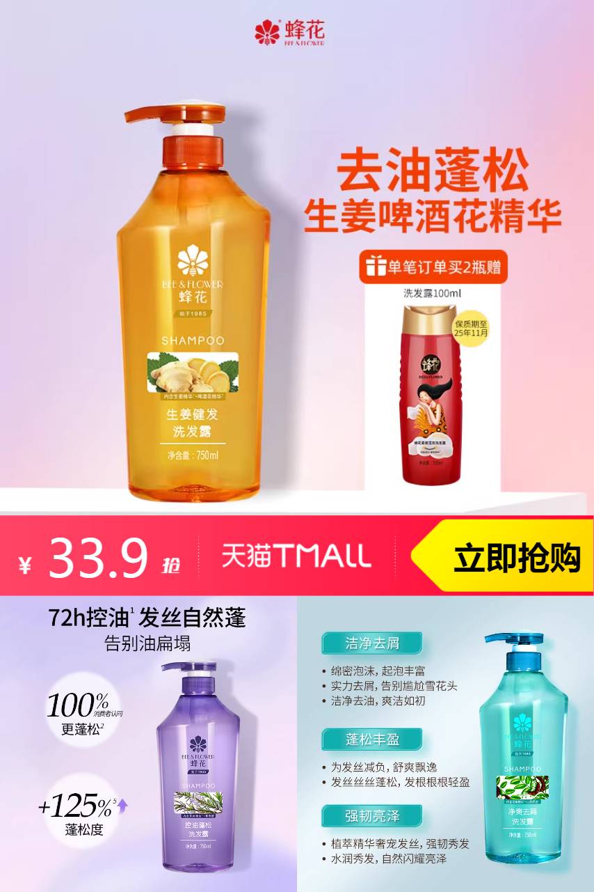 【超级立减8.9元,3元券,淘金币抵扣0.48元,到手33.42元起;买即送防脱袋装8ml*2+控油袋装8ml*1+发膜12g*1+护发精油1ml*2】蜂花洗发水生姜精华无硅油丰盈蓬松洗发露,丰盈蓬松强韧亮泽,蕴含姜油酮类、生姜精油等营养物质,秀发状态在线打造蓬松丰盈感~