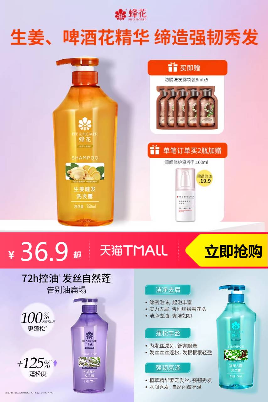 【官方立减8.9元 淘金币2.43元 消费券抵扣4.31元 限时红包1元 到手32元起】蜂花洗发水生姜精华无硅油丰盈蓬松洗发露,丰盈蓬松强韧亮泽,蕴含姜油酮类、生姜精油等营养物质,秀发状态在线打造蓬松丰盈感~