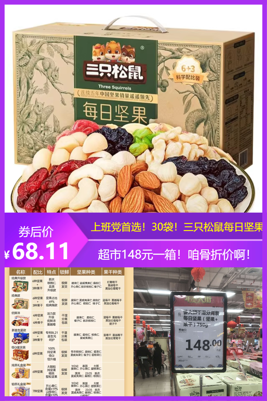 【百亿补贴68.11到手30包!超市杂牌都148块钱啊!】三只松鼠的每日坚果!遇见就是拼手速的时刻!坚果中的王中王!多种营养一次补充,满满一大箱!每天吃一袋,让你元气满满~还可以拿来泡个酸奶!绝了~