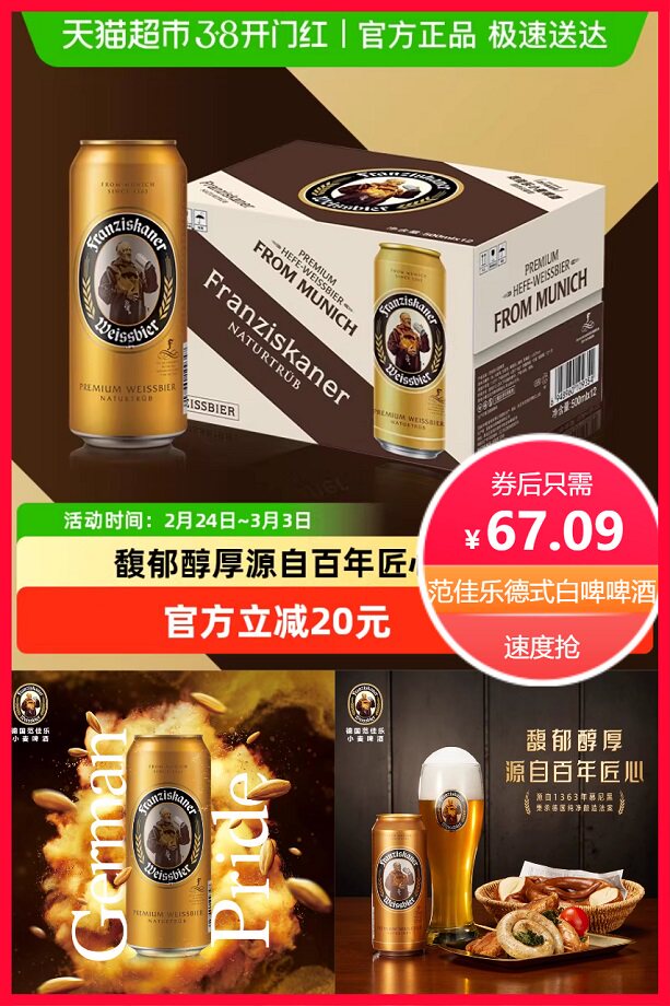 超级立减20元+券3元+88vip省3.8元+淘金币省8.91元后约63.29元,德国范佳乐小麦啤酒,源自1363年德国,秉承德国纯净酿造法案,原料只用水,麦芽,啤酒花,酵母,口感馥郁醇厚!